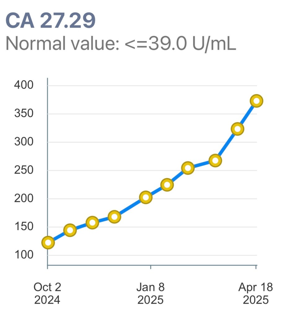 Tumor Markers. My tumor markers (CA 27-29) have been steadily rising, not great. Ideally we want the number to be under 40. As you can see from the chart here, they are above that and trending upward.