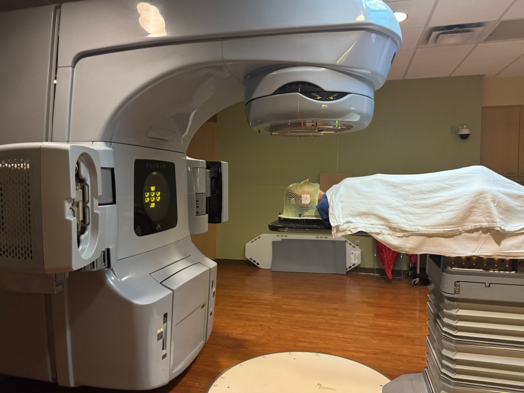 The mask is literally snapped to the table. You can’t move your head at all. You can kind of see through the holes and of course you can breathe. The round equipment above my head rotated all the way around the table that I’m lying on.